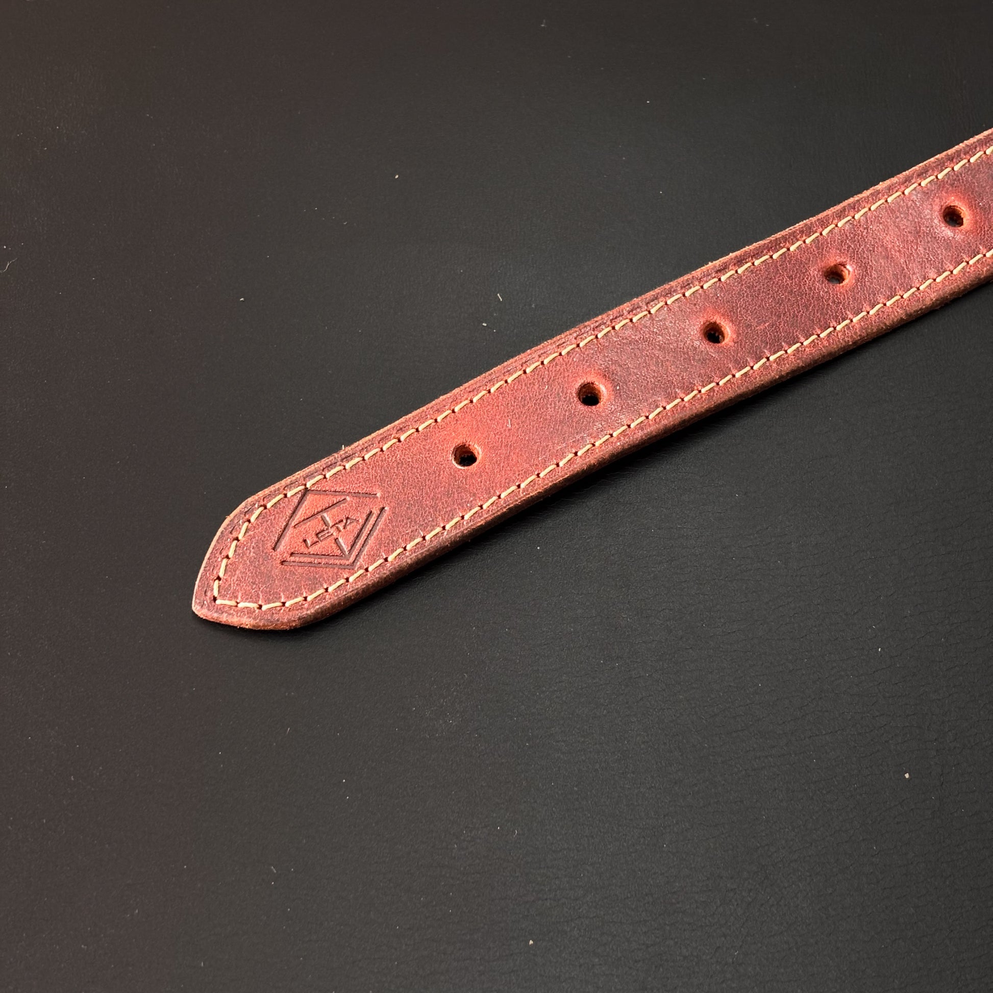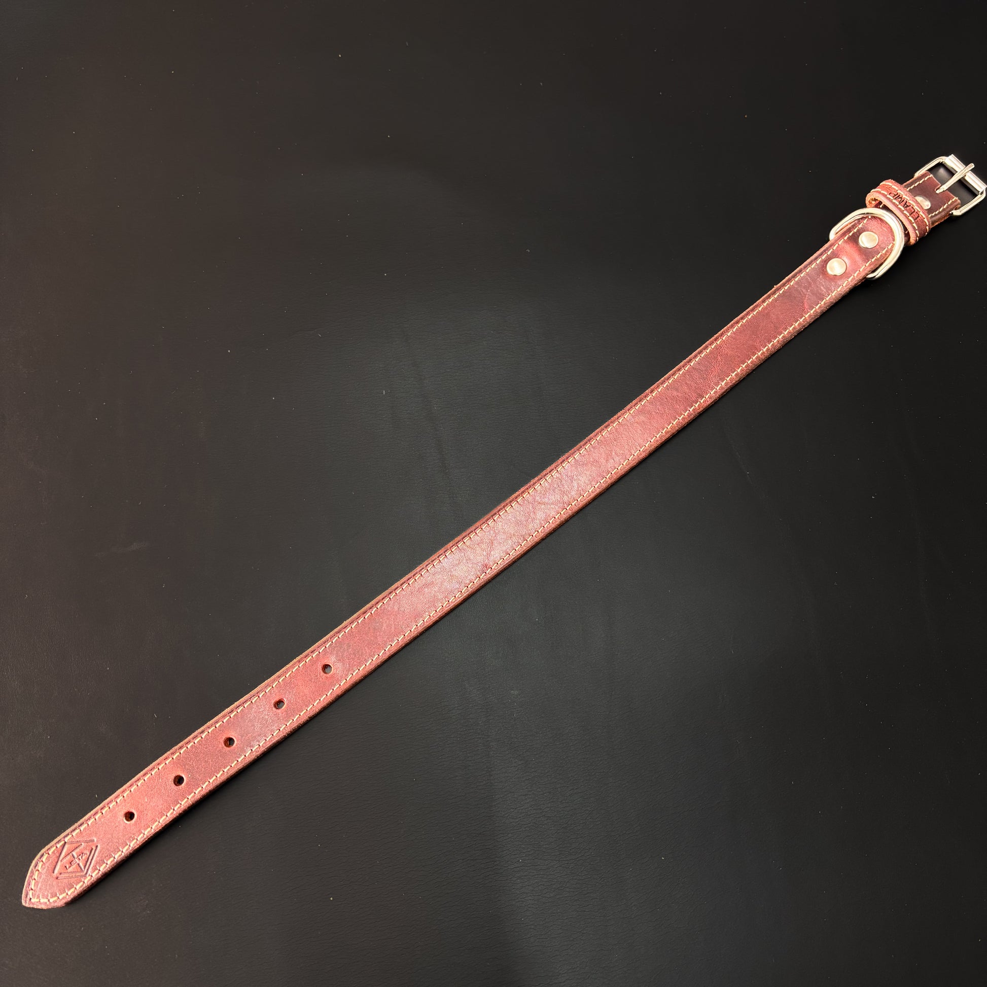 Cada pieza se corta, ensambla y cose manualmente, dando como resultado un collar sólido, funcional y con una estética cuidada y atemporal.